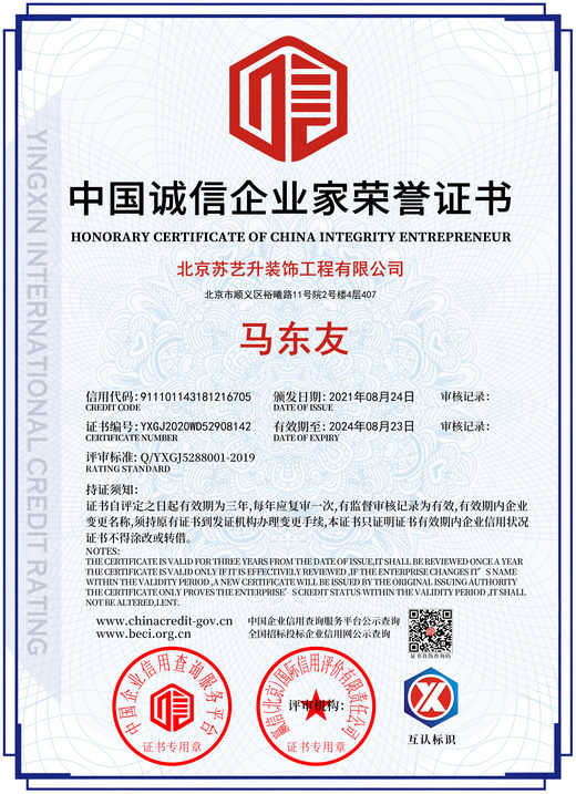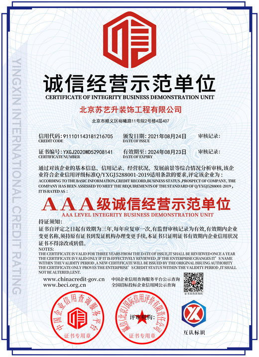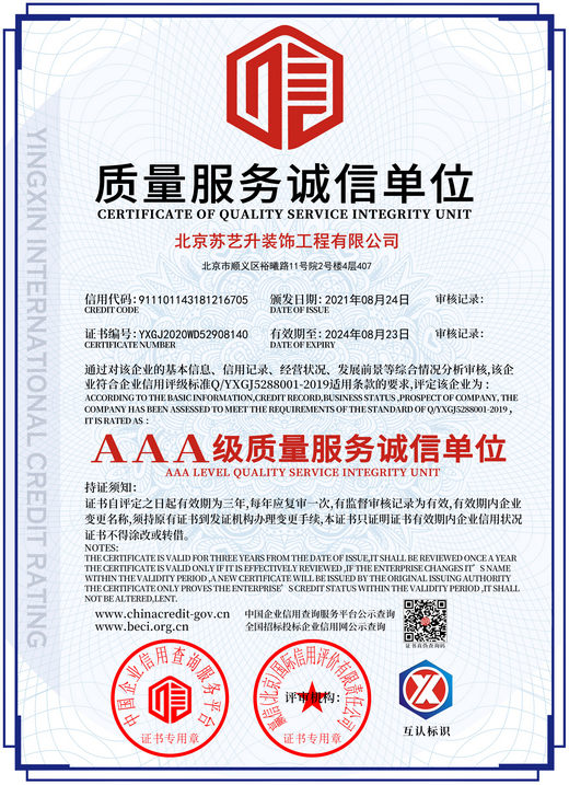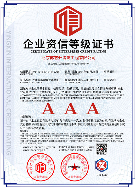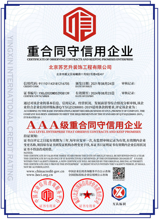 北京蘇藝升裝飾工程有限公司(以下簡稱”蘇藝升裝飾”)成立于2014年,公司前身根植于國內知名雙甲資質企業,通過裝飾行業20余年的磨礪,我們有著豐富的管理和施工經驗,以及一流裝飾公司的技術服務體系,通過不斷的努力和發展現已成為一家頗具實力的獨立法人企業,并成功獲取中華人民共和國住房和城鄉建設部頒發的:建筑裝修裝飾工程專業承包貳級、建筑工程施工總承包叁級、鋼結構工程專業承包叁級、建筑幕墻工程專業承包貳級以及防水防腐保溫工程專業承包貳級資質。 蘇藝升裝飾公司經過多年的磨礪及不...了解更多>